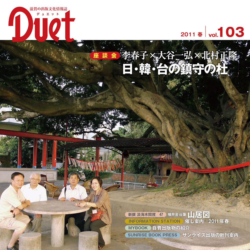 TOP > サンライズを知る > デュエット > バックナンバー > デュエットバックナンバー 滋賀の文化情報誌デュエットバックナンバー Vol.103 座談会 李春子×大谷一弘×北村正隆 日・韓・台の鎮守の杜 Vol.102 対談 髙梨純次×寿福滋 滋賀の仏像を語る Vol.101 座談会 『菩提寺歴史散歩』編集中 5 / 5ページ« 2345