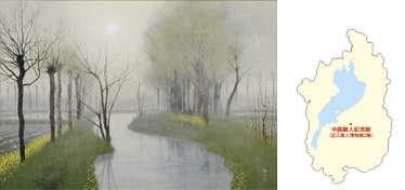 この絵は、湖国の原風景に心惹かれ、60余年もの間、その風景を追い求め、描き続けた日本画家・中路融人(文化功労者・日本芸術院会員)の作品です。その作品に向き合うと、画面からは不思議と肌寒い季節の凛とした -