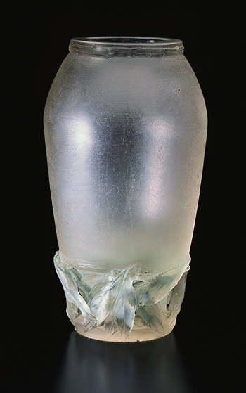1921年にシールペルデュ(蠟型鋳造)で制作されたこの花瓶は、ちょうど手のひらに収まる大きさで、一見シンプルな小品にも見えますが、手には天然石のようなあたたかな感触が伝わります。裾文様にやわらかに溜ま -