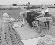 ▲自動脱穀機(自脱)による収穫作業。(昭和51年、びわ町で)