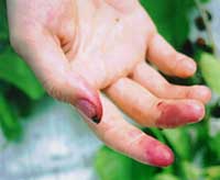 桑の木にクワゴがなるのは六月、着物が汚れるとしかられながらも、こりずに食べる。ふきの葉を二、三枚持って桑畑へ入り、フキの葉にいっぱいになると、ぎゅうとしぼって流れ出る汁をちゅうちゅうと吸う。赤黒い汁は甘い。シャツや唇についた赤い色は、青い桑の実をこすりつけると消える。