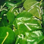 山繭の幼虫。葉の姿に擬態しているため、素人目にはどこにいるのかわからない。蚕に比べて病気や害虫に弱く、枝から逆さにぶら下がったままミイラ化しているものも多い。