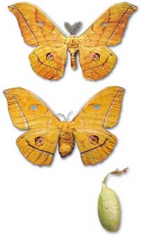 ヤママユの成虫(上が雄、下が雌)と薄い緑色をしている山繭の繭(下)。葉1枚にくるまれたように造る。繭(糸)の色は保護色なので、電灯のもとで飼うと繭が黄色くなる。蚕は首を左右に大きく振って均一に繭を造るので、湯につけるときれいにほぐれ、すぐ糸口も見つかるが、山繭の繭は糸の出し方が不ぞろいなため、糸口がなかなか見つけらないのだという(約700mの糸のうち、最初の約200mは無駄になり、実量は400mほどになる)。