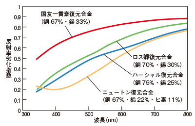 ところが、現存する一貫斎望遠鏡は、4基とも今でも天体観測ができるほど、劣化していなかったんです。冨田さんは試作したそれぞれの割合の金属試料を2003年末から10年放置して2014年に反射率の比較をなさり、やはり一貫斎製作の金属反射鏡が、さまざまな銅・錫合金の中で最も耐食性にすぐれ、かつ光学的にもすぐれた性質をもっていることが明らかになったんです[下のグラフ参照]。