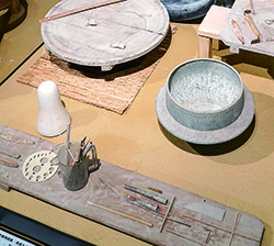 ──白黒写真のパネルを背景に、さまざまな道具が並んでいて興味をそそられます。