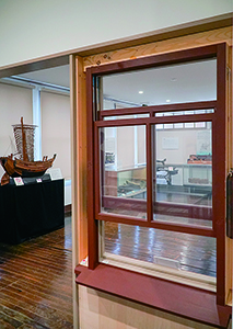 烏野 (ガラッと開けて)これが上下スライド式の窓です。下の桟が斜めになっていて、水がたまらないようにしてあります。当時としては珍しいものです。これを見てもらうために、室内にも設置してあります。隠してある内部の構造が見えるようになっているんですよ。