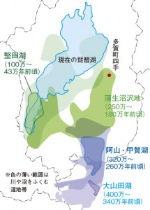 右に示した図は、かつての琵琶湖の範囲を時代順に描いたものです。だいたい400万年ぐらい前には、現在の三重県にあたる場所に大山田湖がありました。それが阿山・甲賀湖、蒲生沼沢地、堅田湖という順で、だんだん北に移動してきたとされています。