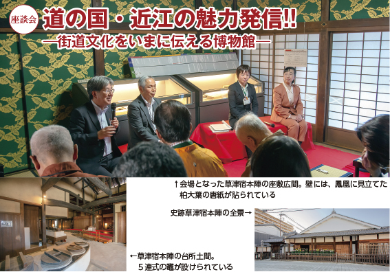 史跡草津宿本陣 住 所:草津市草津一丁目2-8連絡先:TEL 077(561)6636休館日:月曜日(祝日の場合は翌日)、祝日の翌日、年末年始入館料:大人240円、高校・大学生180円、小・中学生120円アクセス:JR琵琶湖線「草津駅」下車 東口から徒歩約10分 名神「栗東IC」・新名神「草津田上IC」から約15分 座談会出席者の所属館の位置(写真は各館提供) 1 2 3 Vol.129 一覧ページ Vol.131