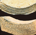 桑原 瓦当(軒丸瓦の先端の丸い部分)にはハスの花をデザイン化した蓮華文が、甲賀寺の軒平瓦(3)にはツル植物をもとにした唐草文様がほどこされています。これらは異国的な香りを残す、みずみずしい開花期の作品ですね。
