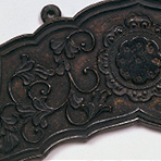 桑原 具体的な由来はわかりませんが、中国古代の磬は、似た形をしています。これが本来の磬の形で、ほかに雲板型や蓮華型のものも集めてみました。つづいて代表的な堂内の荘厳具である華鬘を二つお借りしています。金剛輪寺のもの(8)と京都の細見美術館のものですが、細見さんのものは、近江八幡市の浄厳院伝来とされています。