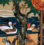 桑原 若冲の『鳥獣花木図屛風』の中にお釈迦さまはいませんが、涅槃図の荘厳※4と似ていると考えることもできます。涅槃図は、仏教の世界で、お釈迦さまの周りを動物や植物が荘厳するものですね。若冲は、相国寺へ釈迦三尊の荘厳として、この世界を「動植綵絵」に描いて寄進したと。