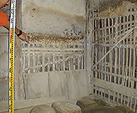 こちらの写真4は、今は取り壊されましたが、吉川家の蔵の内部です。琵琶湖の水が押しよせた高さまでの壁の土はなくなってしまって、竹組みがむき出しになっています。実際に計ってみても、その高さが洪水時の水位と一致したそうです。