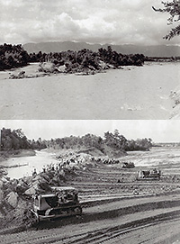 次が決壊現場の写真8です。恐ろしいですね。すぐに、保安隊(現、自衛隊)が派遣されてブルドーザーで堤防をつくりました9。先日、当時を知る方にお話をうかがったのですが、その方はこの時にブルドーザーを初めて見たそうです。
