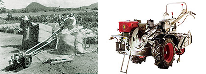 戦前は、エンジンと、それぞれの作業をする機械は別売りで、両者を平ベルトでつないで動かすというかたち(4)だったわけです。そのエンジンで籾摺機を動かしたり、水を田にあげる揚水ポンプを動かしたりして、農業現場の機械化が始まったんです。コンバイン、トラクター、田植機などの一体化した状態の機械が商品として流通するようになったのは、昭和30年代ぐらいからです。展示しているものでいえば、昭和40年前後の耕うん機(5)が1台ありますね。