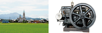 湖北の農村(2)に生まれ育った山岡は、農業分野での需要があることがわかっていました。最初は石油エンジンを製造販売していたのですが、昭和7年(1932)に視察で訪れたドイツ・ライプチヒの見本市でディーゼルエンジンに出会い、国内用にその小型化に取り組みます。翌年、世界初の小型ディーゼルエンジンHB型(3)を完成させ、昭和11年(1936)に尼崎に設立した山岡内燃機でディーゼルエンジンの生産を開始しました。