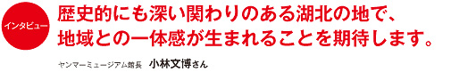 創業者である山岡孫吉生誕の地ということで、工場群も多いですし、従業員をふくめ関わっている方が多い地でもあります。長浜工場設置が昭和17年(1942)ですから、ヤンマーのモノづくりの現場に3代続けて携わっているといった方もおられます。歴史的にもトータルで深い関わりがある湖北の地の方が、都会よりも館と地域の一体感が生まれるのではないか、という期待もあります。