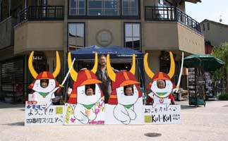 鳥居 看板を設置したのは旧八日市市が市制50周年を迎えた2004年。大凧まつり実行委員会で記念品をつくり、50市町村の連凧を揚げ、そして顔出し看板をつ くったのです。オーナー募集の案内が届いた翌日に電話をかけました。「1万円の補助が出ます」というのにだまされました(笑)。実際には一番高い看板をつ くりました。最初は穴がひとつだったのですが、ペアで顔出しできるよう、ふたつ開けてもらいました。
