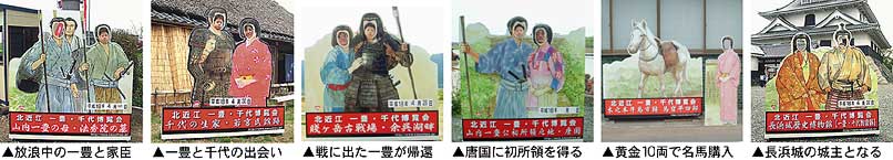 ▼「一豊・千代ドラマツアー」の各ポイントに設置された顔出し看板。順に回ると、夫婦の出世物語に(米原市、長浜市、虎姫町、木之本町)