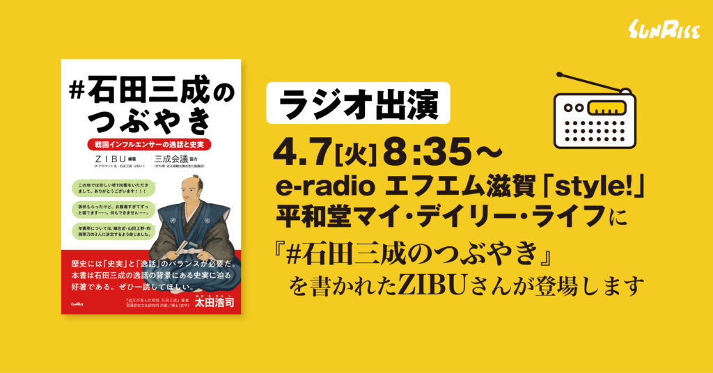 【ラジオ出演】4/7(火)am8:35~e-radio エフエム滋賀「style!」平和堂マイ・デイリー・ライフに『#️石田三成のつぶやき』を書かれたZIBUさんが登場します