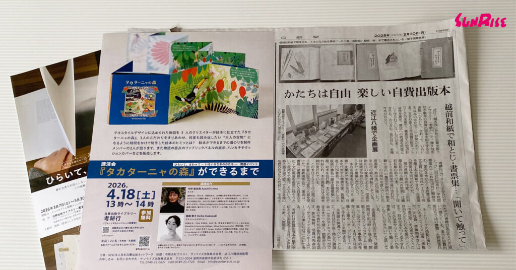企画展の関連イベントとして、4月18日午後1時から講演会「『タカターニャの森』ができるまで」を開く。蛇腹折りの絵本の作者たちが制作過程を話す。参加無料。定員は先着20人。サンライズ出版のホームページから申し込むことができる。