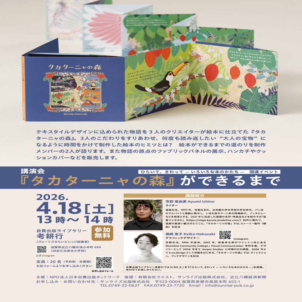 企画展の関連イベントとして、4月18日午後1時から講演会「『タカターニャの森』ができるまで」を開く。蛇腹折りの絵本の作者たちが制作過程を話す。参加無料。定員は先着20人。サンライズ出版のホームページから申し込むことができる。