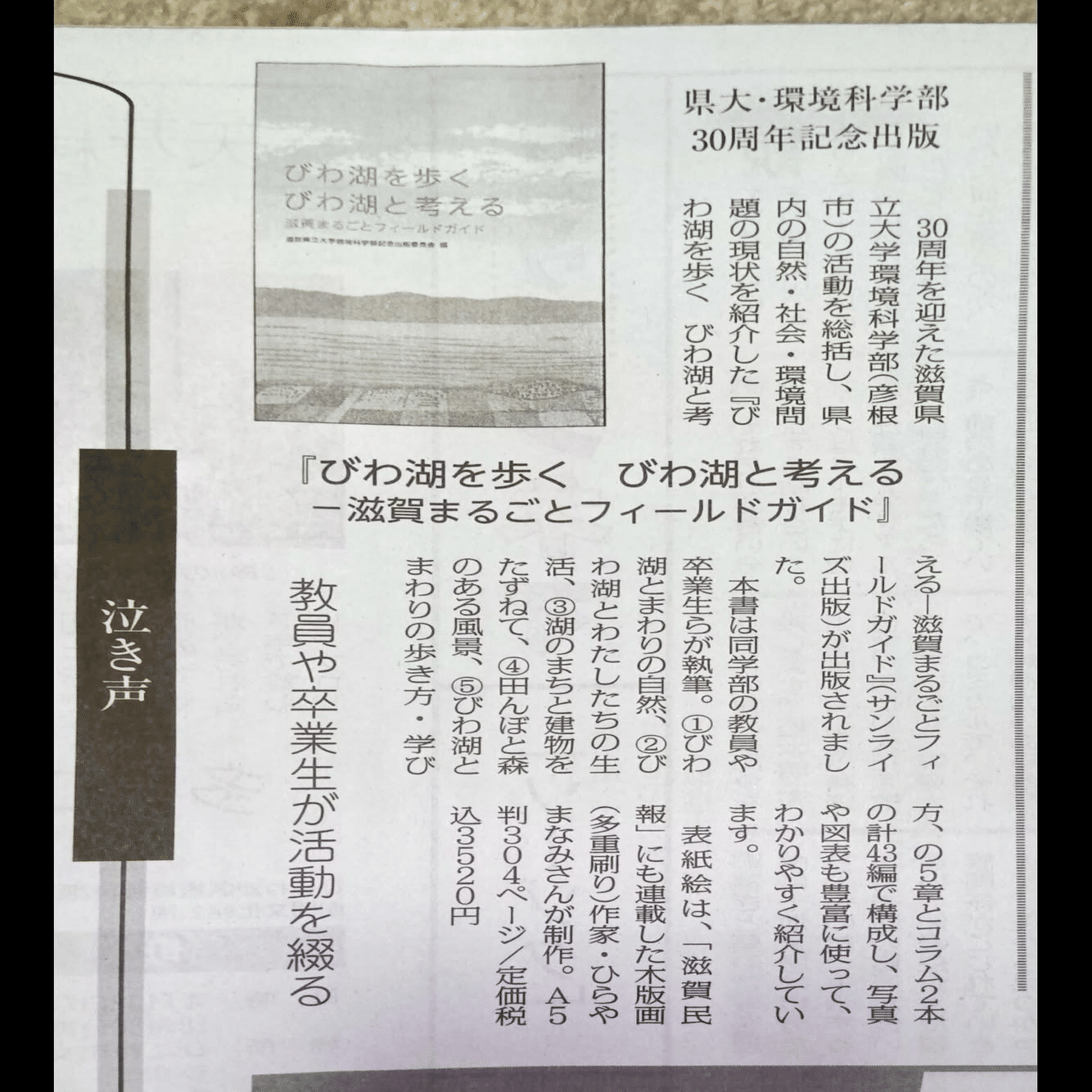 TOP > ブログ > 【滋賀民報】『びわ湖を歩く びわ湖と考える』が紹介されました 【滋賀民報】『びわ湖を歩く びわ湖と考える』が紹介されました 2026.03.13 専務のブログ 2026/03/13 岩根治美Facebookより転載 滋賀民報に『びわ湖を歩く びわ湖と考える』が紹介されました。カバー画は以前滋賀民報にも連載されたひらやまなみさんです。さまざまな角度からびわ湖の事がやさしく書かれていますので、好きなことろから読み進める事ができます。 前の記事へ 一覧ページ 次の記事へ