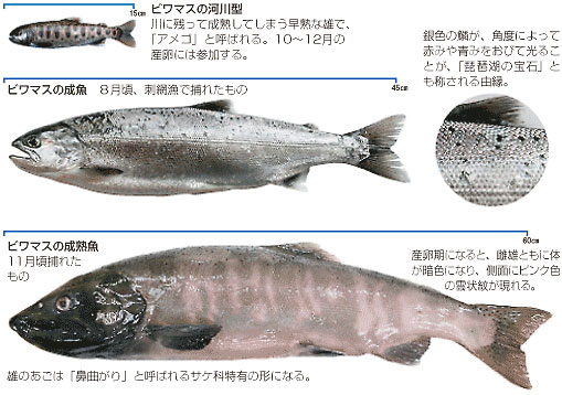 人の利用 食用になる。サクラマスはサナダムシが寄生していることがあるので生食用に向かないが、ビワマスは刺身でも賞味される。1匹を丸ごと炊き込みご飯に入れた「アメノイオ御飯」は、1998年に滋賀の食文化財の一つに選ばれた。長浜市南浜町では、麴を混ぜたご飯で漬けた「コケラズシ」が祝い事などの際につくられる。