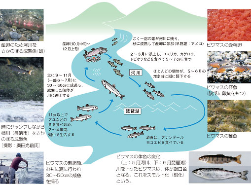 生態 稚魚は体長7㎝ぐらいまで川で生活し、6月頃、雨による増水に乗って、そのほとんどが琵琶湖へ下る(一部の雄は川に残り小さなまま成熟してアメゴとなる)。琵琶湖で2〜4年間、アナンデールヨコエビやアユなどを食べて生活し、10〜12月、成熟したものが川をさかのぼって産卵する。