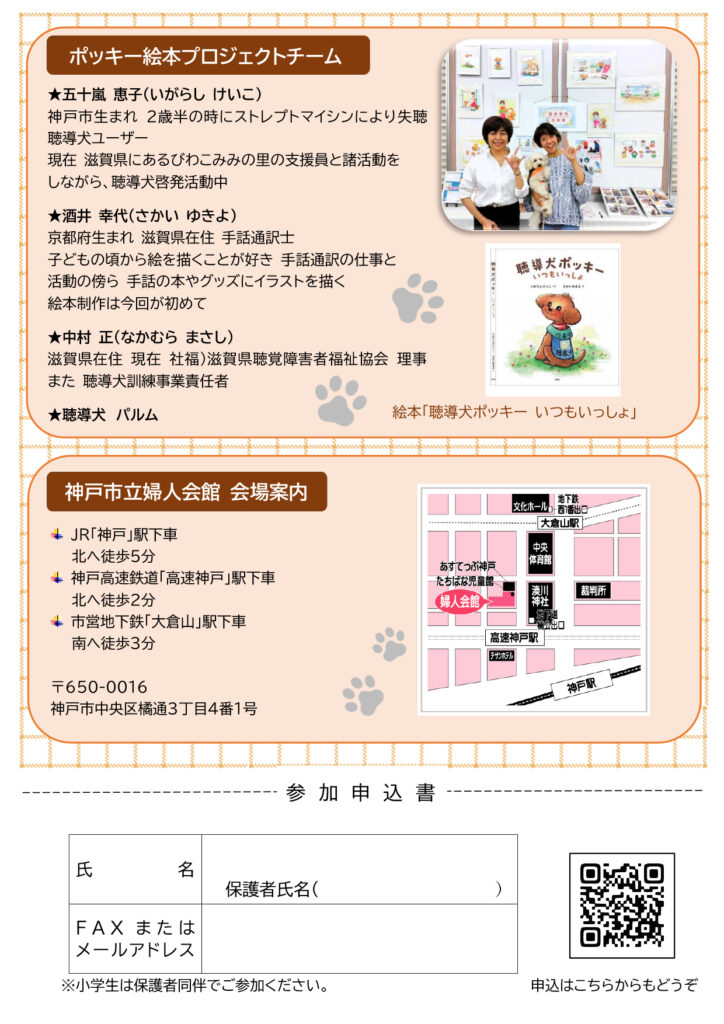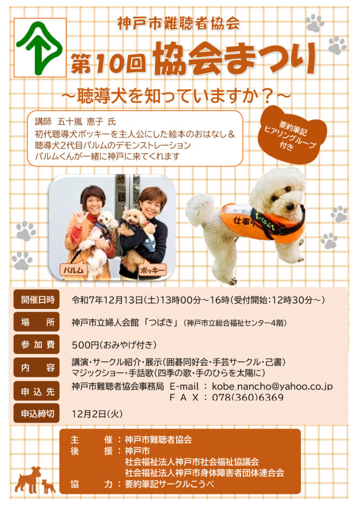 【12/13土】神戸市難聴者協会 第10回協会まつりに『聴導犬ポッキー いつもいっしょ』著者・五十嵐恵子さん&聴導犬パルムが登壇します 2025.12.12 日時 12月13日(土) 13:00~12月13日(土) 16:00 神戸市立婦人会館「つばき」(神戸市立総合福祉センター4階) 『聴導犬ポッキー いつもいっしょ』著者・五十嵐恵子さん講演、聴導犬パルムが聴導犬のお仕事を実演します。 ◆神戸市難聴者協会 第10回 協会まつり 日時:2025年12月13日(土) 13時~16時場所:神戸市立婦人会館「つばき」(神戸市立総合福祉センター4階)参加費:500円(おみやげ付)内容:五十嵐恵子さんの講演ほか主催:神戸市難聴者協会 聴導犬ポッキー いつもいっしょ 前の記事へ 一覧ページ